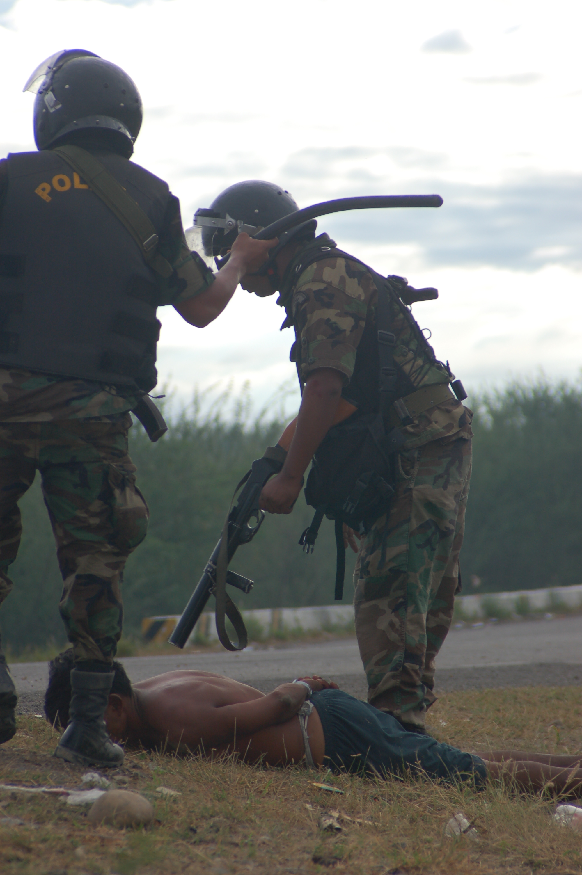 Agentes de la DINOES golpeando a indígena amarrado al lado de la carretera.