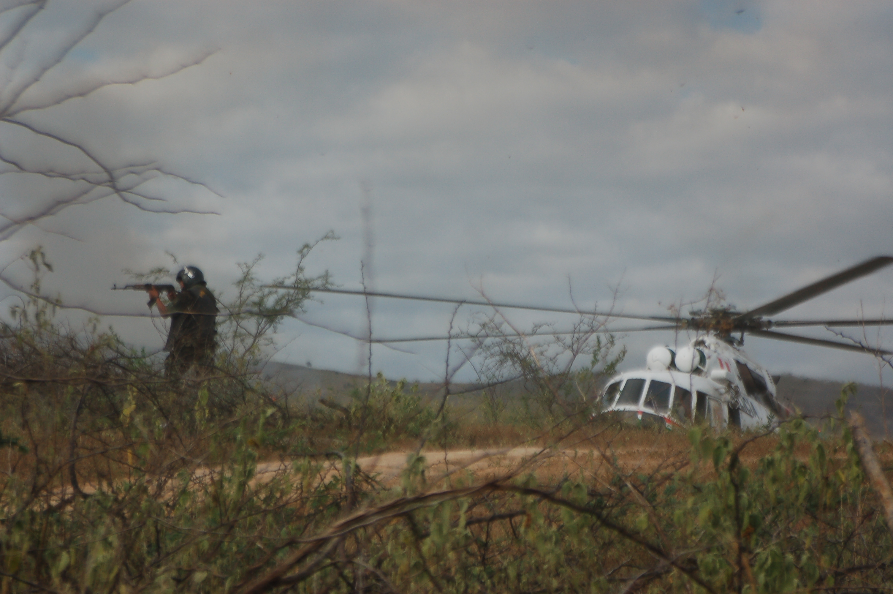 Agente de la DINOES en las colinas de Bagua, disparando un fusil AKM.