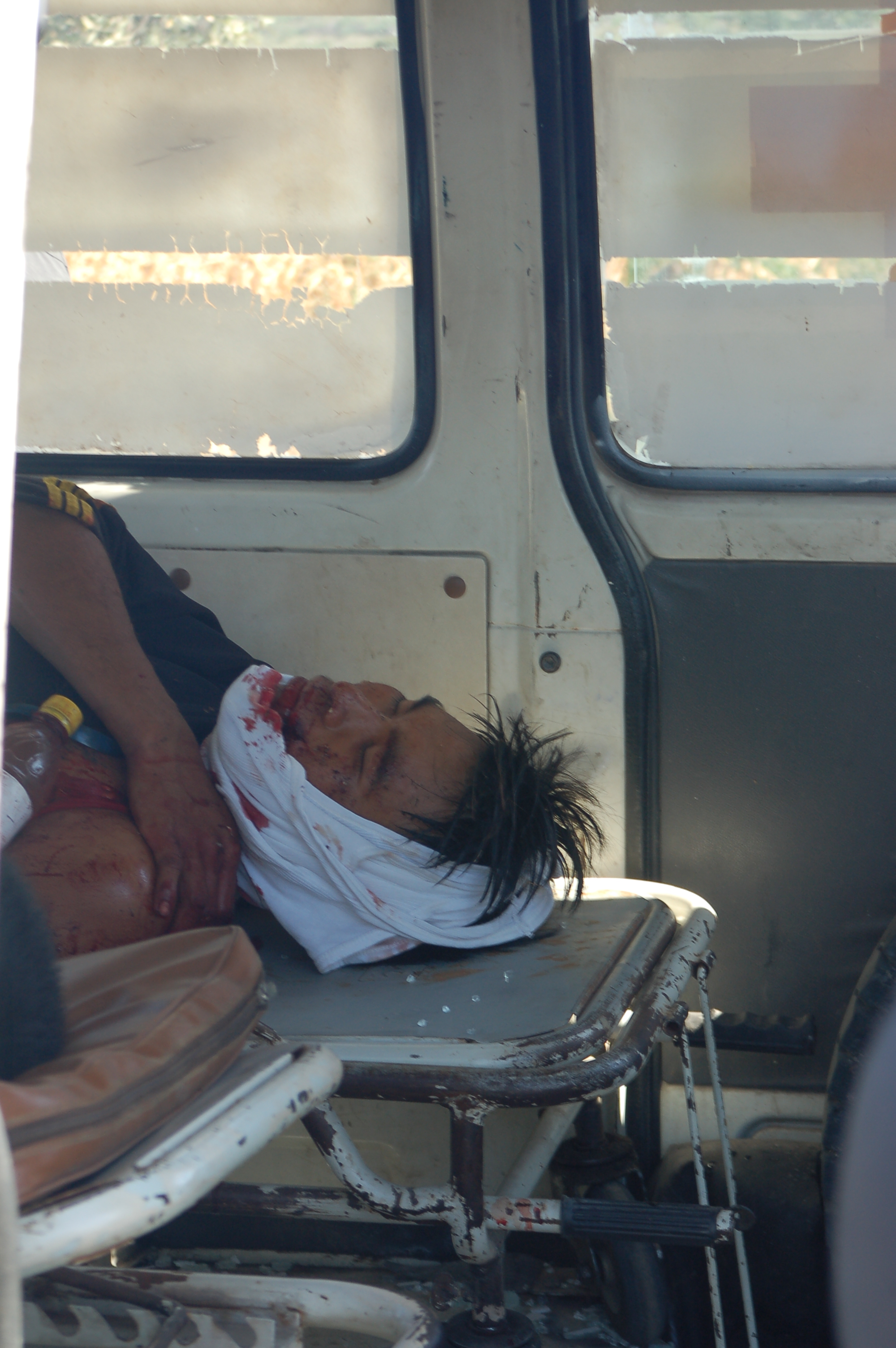 Herido dentro de ambulancia interceptada. Supuestamente, la policía extrajo un fusil AKM